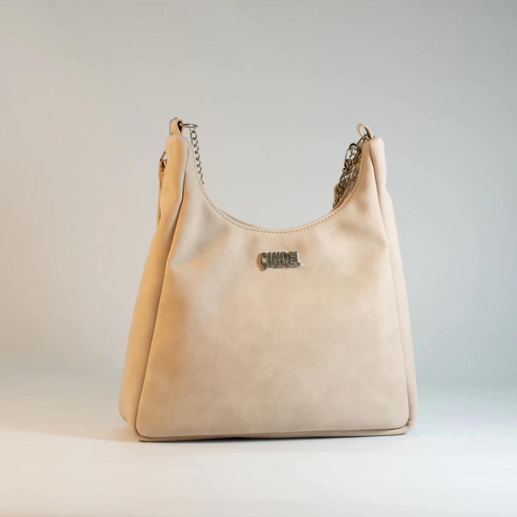 Cierre de niquel a tono a lo largo de la cartera. Manijas fijas de hombro (30cm de largo). Detalles de CADENA en el frente.